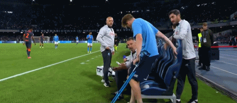 第65分钟,不容乐观,德布劳内已经拄拐来到场边替补席