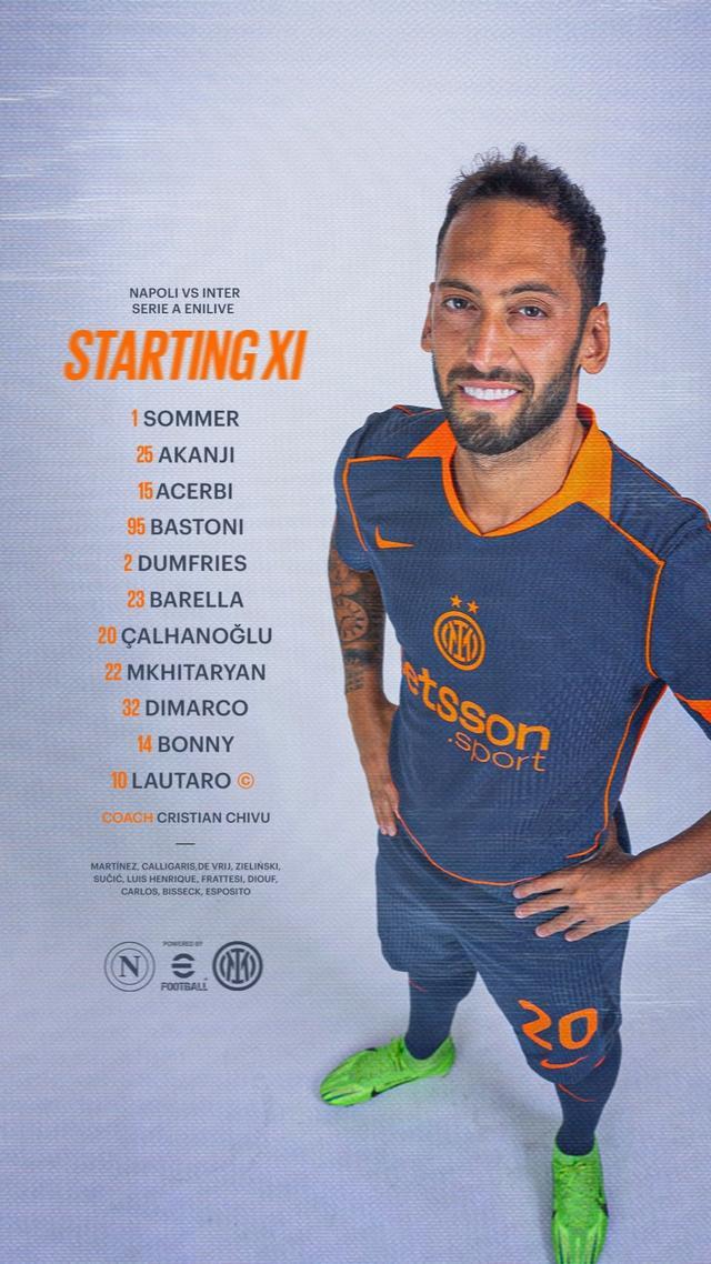 国米首发:1-索默、25-阿坎吉、15-阿切尔比、95-巴斯托尼、2-邓弗里斯、23-巴雷拉、20-恰尔汗奥卢、22-姆希塔良、32-迪马尔科、14-博尼、10-劳塔罗