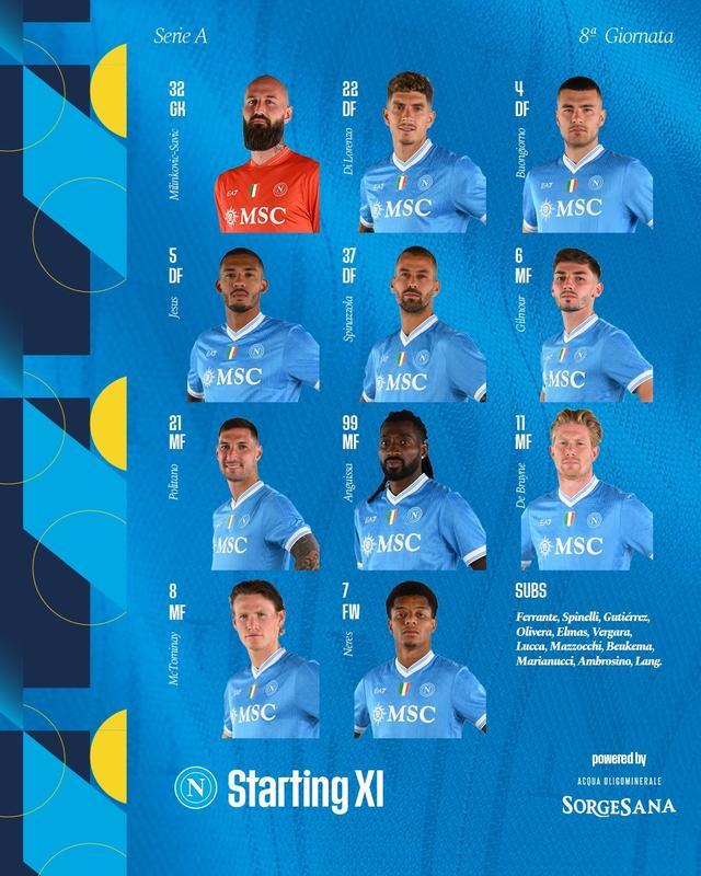 那不勒斯首发:32-萨维奇、22-迪洛伦佐、4-布翁焦尔诺、5-胡安-热苏斯、37-斯皮纳佐拉、6-吉尔摩、21-波利塔诺、99-安古伊萨、11-德布劳内、8-麦克托米奈、7-内雷斯