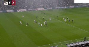 曹法尔任意球开出,基米希门前伸脚致变线,霍芬海姆扳回一球